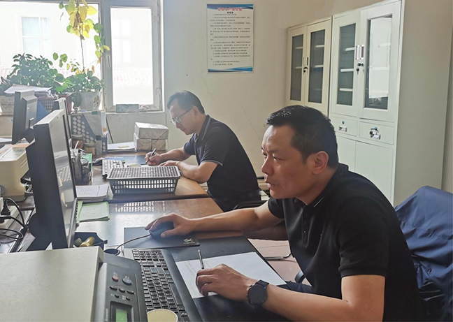 吳桂高(右)現(xiàn)場調(diào)閱材料