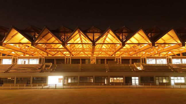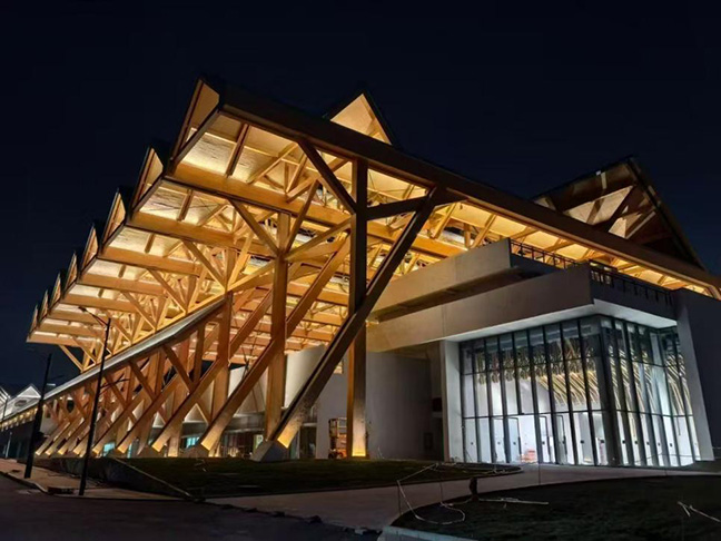 光明國際馬術(shù)中心的主場館以“木構(gòu)新境、眾檐共景”為核心設(shè)計(jì)概念,整體采用膠合木結(jié)構(gòu)。蘇州昆侖綠建在參與設(shè)計(jì)過程中,巧妙地將傳統(tǒng)木構(gòu)的榫卯工藝與現(xiàn)代膠合木技術(shù)結(jié)合,既延續(xù)了千年木構(gòu)技藝的匠心精髓,又賦予了建筑輕盈通透的現(xiàn)代美感,為場館的穩(wěn)固性與藝術(shù)性提供專業(yè)保障。